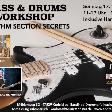 Unsere MusicMonster Coaches Wolf und Andreas bieten gemeinsam diesen schönen Workshop an. Ihr könnt euch alleine oder als feste Rhythm Section anmelden. Auf www.Andreas-Reinhard.de könnt ihr euch unter „Unterricht > Workshops > Shop“ auch direkt online anmelden. Oder ihr kontaktiert die beiden hier über MusicMonster. Bis Ende September gibt es Frühbucherrabatt. WANN? Sonntag 17. November … Mehr Bass & Drums Workshop „Rhythm Section Secrets“