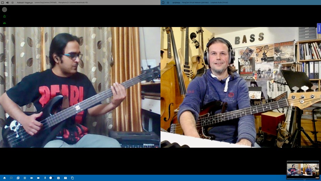 Online lessons have been available for years, but really broke through due to Corona. Reservations such as: “That’s definitely very complicated with the technology” or “You’ll learn a lot less there” have vanished into thin air, such that some students who previously had “on-site” lessons now regularly continue online. I now have online students around the world. In the picture you can see me in class with Aakash in Mumbai / India.